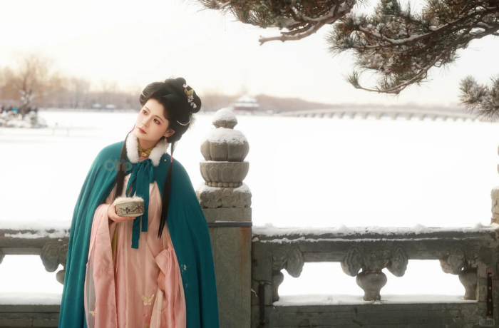 Mùa đông, du khách mặc Hán phục tạo dáng bên hồ băng, cầu đá, hay dưới tán cây phủ tuyết.