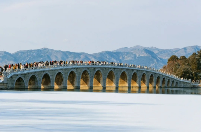 Mặt hồ Côn Minh đóng băng, cầu đá Thập Thất Khổng in bóng dưới ánh nắng mờ. Khung cảnh yên ả, khiến du khách có cảm giác như lạc vào thế giới cổ trang.