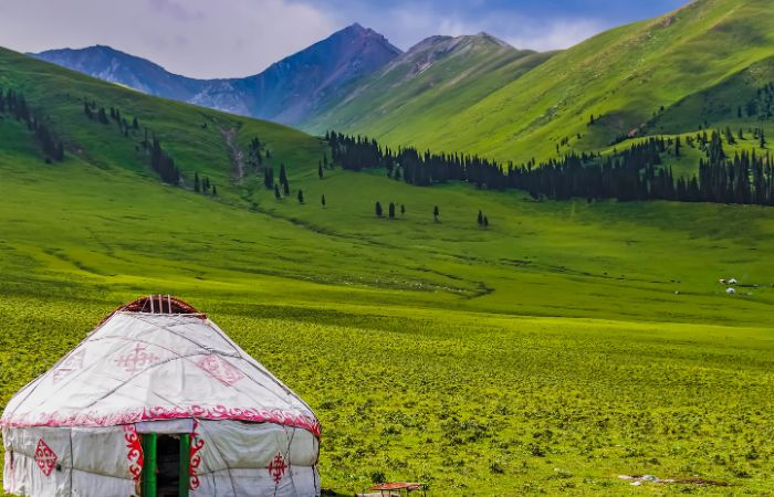 Trên đường từ hồ Sayram đến Nalati, bạn sẽ thấy những lều trại trắng nằm giữa cỏ xanh, khói bếp bay lên từ xa. Đó là nơi người Kazakh sinh sống. Họ nuôi dê, cưỡi ngựa, và uống sữa lên men mỗi ngày.
