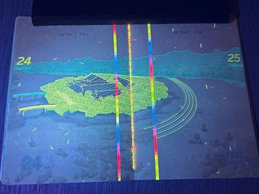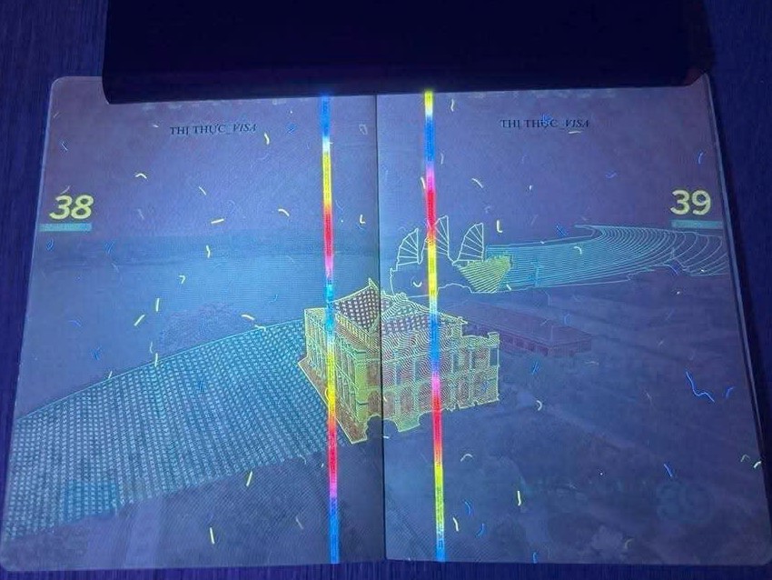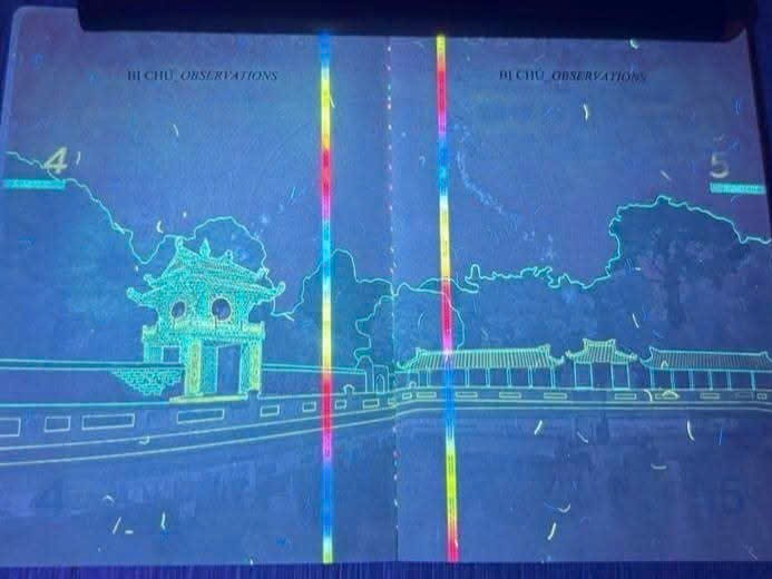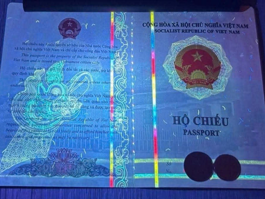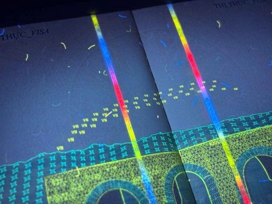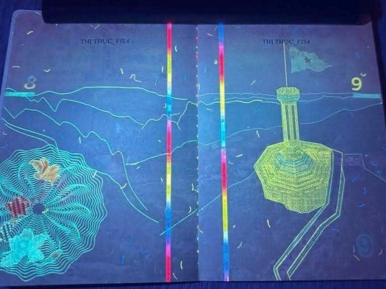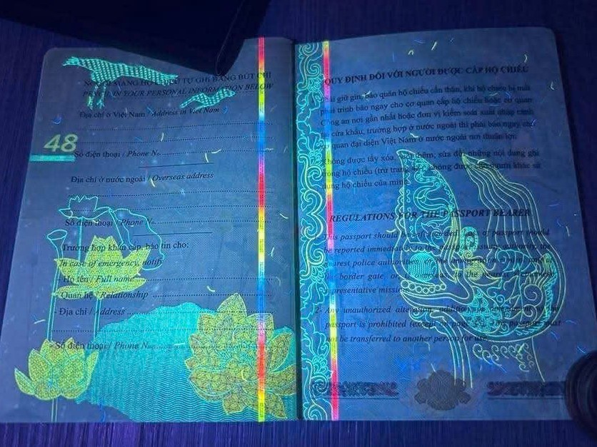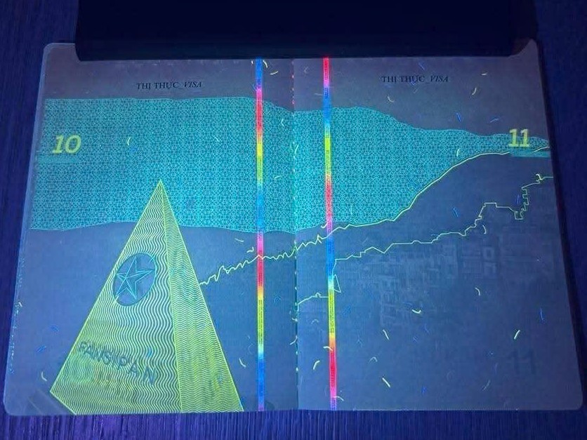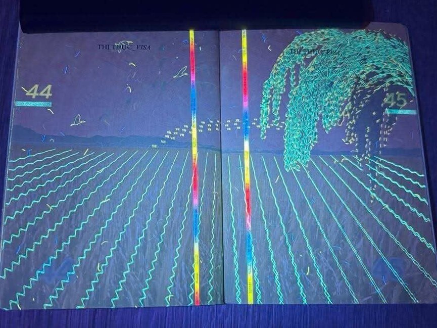 Khi chiếu tia cực tím, các lớp mực huỳnh quang và giấy đặc thù trong hộ chiếu Việt Nam phát sáng rực rỡ.