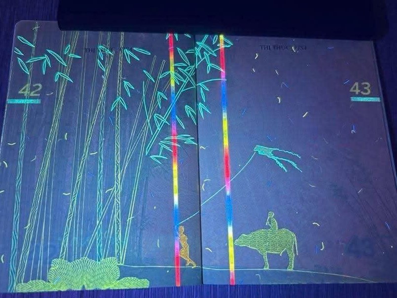 Từ đường nét phong cảnh, họa tiết di sản cho đến biểu tượng trống đồng. Mỗi chi tiết đều được thể hiện khéo léo. Vừa mang tính nghệ thuật, vừa thể hiện công nghệ in ấn hiện đại.