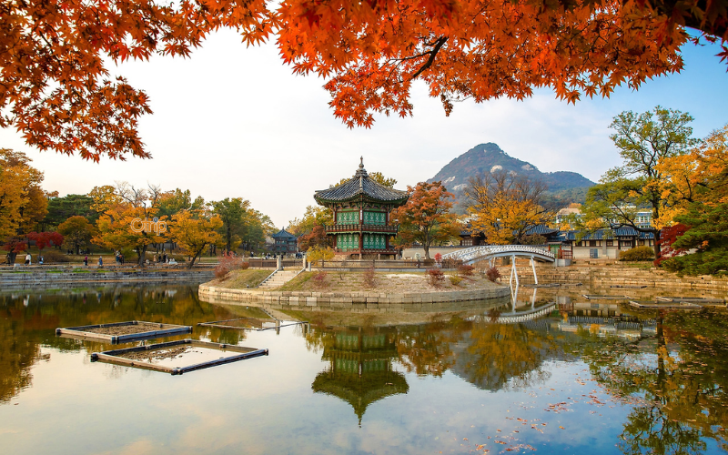 Cung điện Gyeongbokgung là biểu tượng lịch sử của Seoul. Những tán lá vàng soi bóng bên hồ nước phẳng lặng. Du khách thường thuê Hanbok để chụp ảnh kỷ niệm tại đây. Đây là địa điểm du lịch Hàn Quốc mùa thu hàng đầu. Bạn sẽ cảm nhận được không gian hoàng gia xưa cũ.