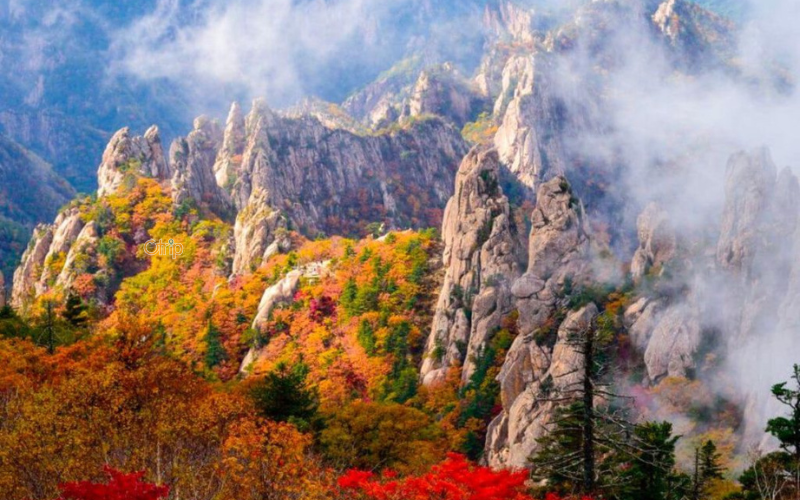 Nếu bạn thích thiên nhiên, hãy đến công viên quốc gia Seoraksan. Những vách đá hùng vĩ xen lẫn màu lá phong đỏ rực. Bạn có thể đi cáp treo để ngắm toàn cảnh từ trên cao. Seorak là địa điểm du lịch Hàn Quốc mùa thu thu hút tín đồ trekking. Không khí trong lành sẽ giúp bạn xua tan mệt mỏi.